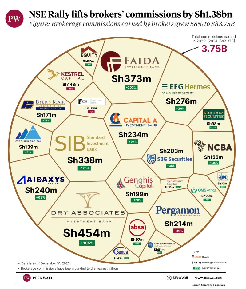 - Even smaller firms saw outsized growth. ABC Capital’s commissions jumped to Sh37 million from Sh11 million, while Francis Drummond rose to Sh61 million from just Sh6 million a year earlier.